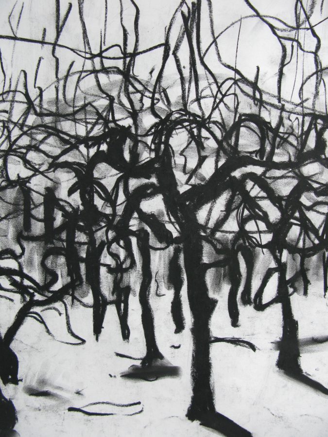 I made rapid drawings for fear of being evicted by the farmer, but as my nerve grew I rolled out large pieces of paper and painted on the orchard floor using pastels and brushes on poles. I got more creative with my brushes using mop heads and making my own drawing tools. The trunks became simplified into carborundum prints and etchings back in the print studio.